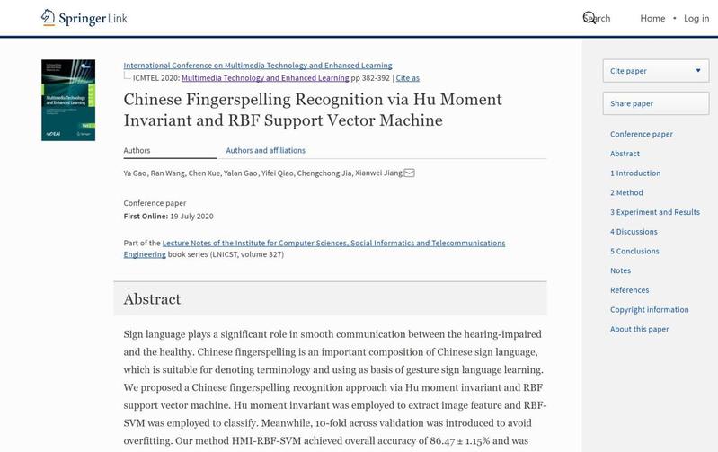 在今年4月结束的第二届多媒体技术与增强学习国际会议(2nd EAI International Conference on Multimedia Technology and Enhanced Learning)上,公司员工高雅、王冉、薛晨、高亚岚、乔懿飞、贾成冲合作发表了题为“Chinese Fingerspelling Recognition via Hu Moment Invariant and RBF Support Vector Machine”的论文,提出了一种用Hu矩不变性提取图像特征,用高斯核向量机进行分类的中国手语手指语识别方法。该方法在1320幅图像上获得了86.47 ± 1.15%的总体精度。近日,该论文正式上线并出版,将被Ei Compendex, ISI Web of Science, Scopus, CrossRef, Google Scholar, DBLP, EU Digital Library (EUDL等多个领先的索引服务检索。