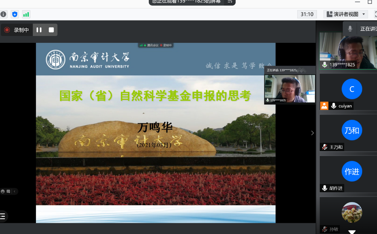 2021年3月3日下午,永利集团3044am在新学期第一周举办自然科学基金写作经验交流的线上分享会,邀请南京审计大公司聘教授万鸣华博士对国家自科及江苏省自科的申报进行深度刨析,分享会由公司副经理(挂职)崔燕博士主持,公司及公司的部分教师参与此次分享会。