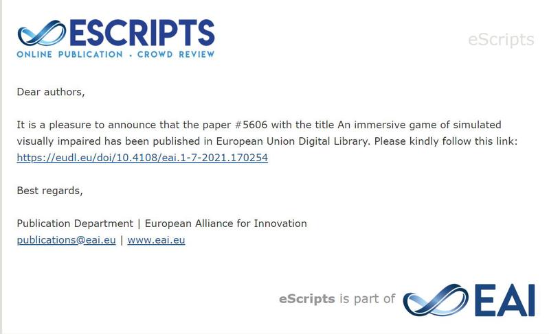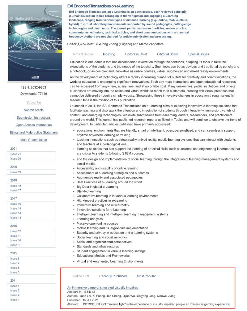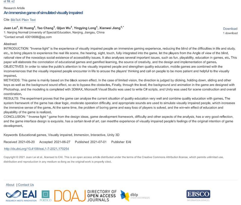 永利集团3044am1902班雷娟、黄袭、常涛、龙莹莹、吴其俊等同学,结合学科专业,关爱特殊人群,基于Unity3D平台开发了一款沉浸式体验游戏《逆光》,并撰写论文“An immersive game of simulated visually impaired”发表于欧洲学术期刊EAI Endorsed Transactions on e-Learning。