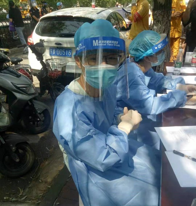 来自数信2004班的王烨民同学是土生土长的南京人,他认为在家乡出现疫情的情况下,自己需要去贡献一份力量,于是报名成为一名抗疫志愿者。连续8天时间里,他风雨无阻,帮助老年人在社区组织的核酸检测过程中开健康证明、申请健康码;负责控制社区人员进出、测量体温等事务。在问到这次志愿服务的感想时,他说:“我觉得国家需要我们的时候,我们就该做到牺牲小我,帮助大家。俗话说得好:患难见人心。在这种危难的情况下,更能看出我们的民族凝聚力。众志成城,方能轻松渡过难关!”