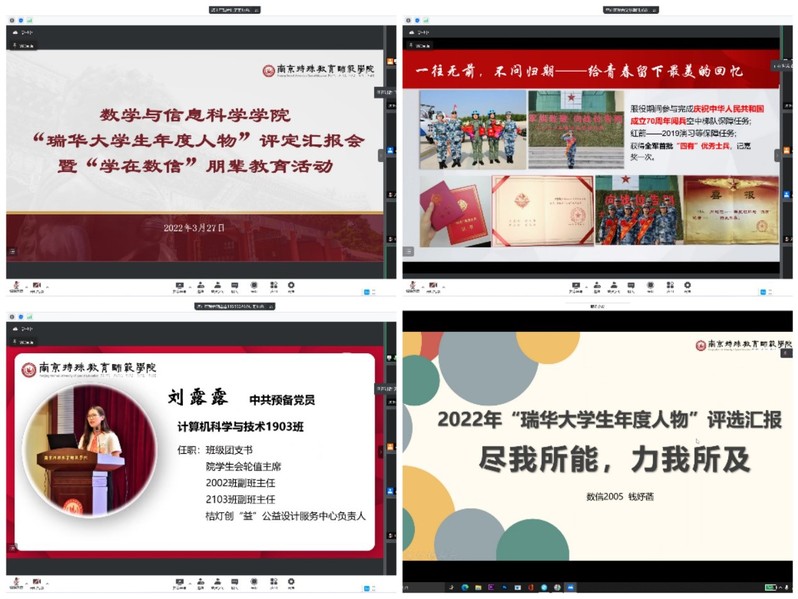 3月27日,永利集团3044am线上开展2022年“瑞华老员工年度人物”评审汇报会暨“学在数信”朋辈教育活动,会议由辅导员樊琬老师主持,党总支副书记丁雯、全体辅导员老师和2019、2020、2021级员工代表参加此次会议。