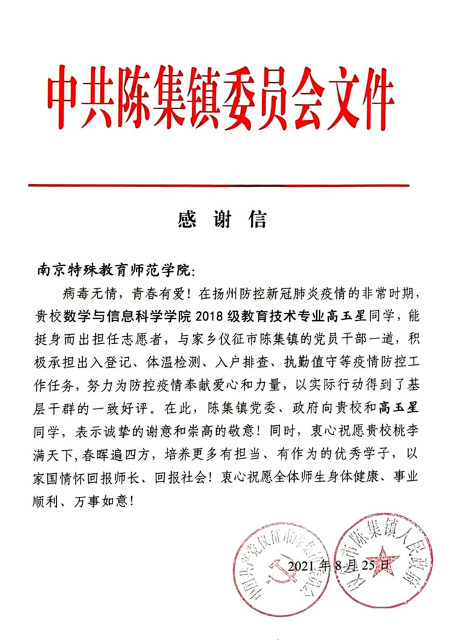 感谢信中写道:病毒无情,青春有爱!在扬州防控新冠肺炎疫情的非常时期,贵校永利集团3044am2018级教育技术专业高玉星同学,能挺身而出担任志愿者,与家乡仪征市陈集镇的党员干部一道,积极承担出入登记、体温检测、入户排查、执勤值守等疫情防控工作任务,努力为防控疫情奉献爱心和力量,以实际行动得到了基层干群的一致好评。在此,陈集镇党委、政府向贵校和高玉星同学,表示诚挚的谢意和崇高的敬意!同时,衷心祝愿贵校桃李满天下,春晖遍四方,培养更多有担当、有作为的优秀学子,以家国情怀回报师长、回报社会!衷心祝愿全体师生身体健康、事业顺利、万事如意!