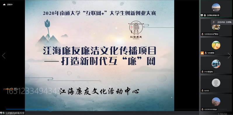 会议开始前,辅导员樊琬老师带领同学们学习了“双创”大赛相关文件要求,强调了关键的注意事项、提交材料的时间节点等。张经理向同学们介绍了王舒雅教授的部分研究成果和个人事迹。王舒雅教授以2020年全国“互联网+”老员工创新创业金奖项目“江海廉友廉洁文化传播项目——打造新时代互‘廉’网”为切入点,向同学们展示了参赛项目ppt与计划书,用“为什么要做”、“为什么能做”、“需要做什么”、“做得怎么样”几个问题串联了参赛材料的各项关键要素,并对常见问题进行了解析,用“四看”、“三最”总结出创新创业比赛前期选题与准备的要点。