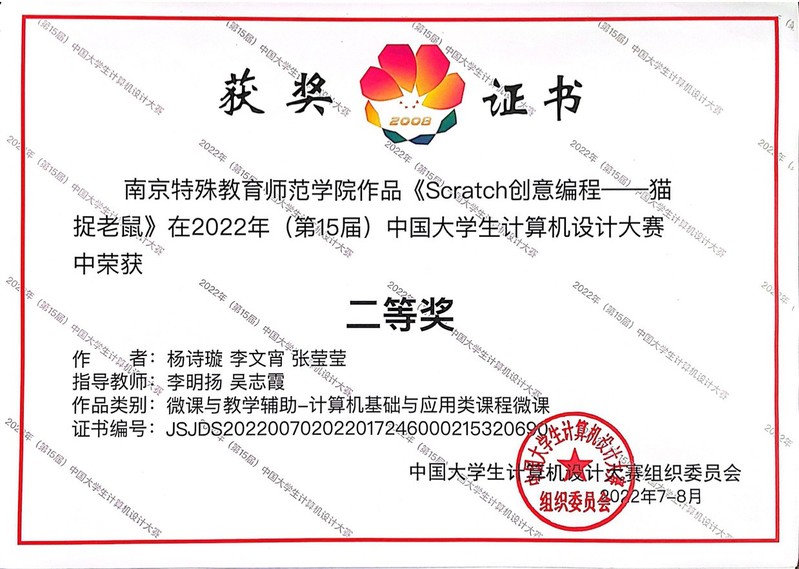 《Scratch创意编程——猫捉老鼠》是由公司李明扬、吴志霞老师指导,由永利集团3044am的杨诗璇、李文宵和张莹莹三位同学共同制作完成的计算机基础与应用类课程微课。在参赛师生团队的充分准备下,经过近4个月的反复打磨和修改,从省赛中脱颖而出并进入国赛,最终荣获了国赛二等奖。