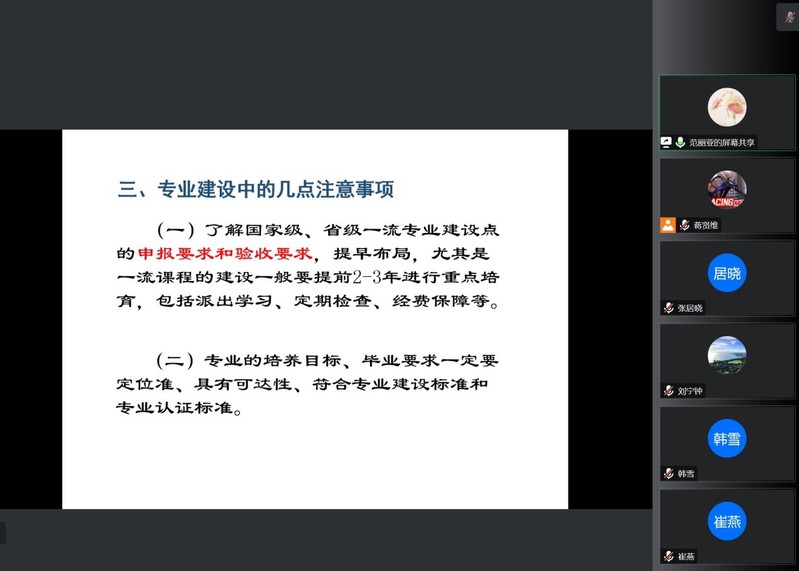 专家们首先肯定了公司近年来的发展和取得的成绩,尤其在优秀人才引进和科研成果方面的进步给人印象深刻。专家指出专业建设要有长远规划和顶层设计,结合公司具体情况要找准特色定位和影响力辐射,同时要注重政策层面的引导和激励。专家还指出要关注行业特色,结合相关领域,发挥团队作用,做有组织的教科研,充分调动教师个体的积极性。专家们还就专业建设过程的注意事项给出了详细指导。他们指出:要清楚了解省级一流专业建设点的申报要求和验收要求,提早布局,尤其是一流课程的建设一般要提前2-3年进行重点培育;课程目标如何达成、达成度如何计算、未达成的原因、如何进行改进等要有明确的计算方法和说明;省部校级文件的收集学习与讲解、专业建设材料的收集与整理、申报书验收报告的撰写等工作都要有专人负责,且有若干个团队协同工作;课程和教材要注意校内辐射和校外推广;建设成果不仅是教师的成果,更要重视员工的成果和获奖;要构建完整的教学质量保障体系和常态化监控机制。