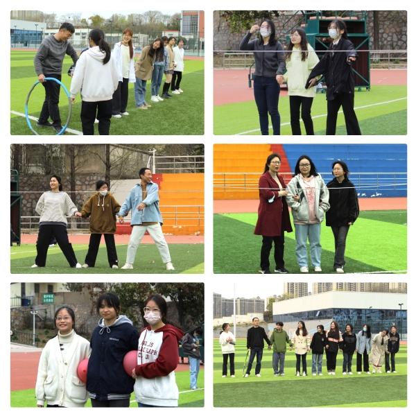 本次趣味运动会共分为“共渡难关”、“心心相印”、“同心协力”三项。同学们与老师并肩下腰走过一定高度的杆子后,每两个人夹着气球行走至下一个环节,九个人手拉手依次钻过呼啦圈,中途不掉即为成功,全程以接力赛的方式展开,按照每组完成时长记录成绩。运动会现场,参赛的成员激情盎然,观众为运动员们加油助威,掌声、欢呼声此起彼伏。