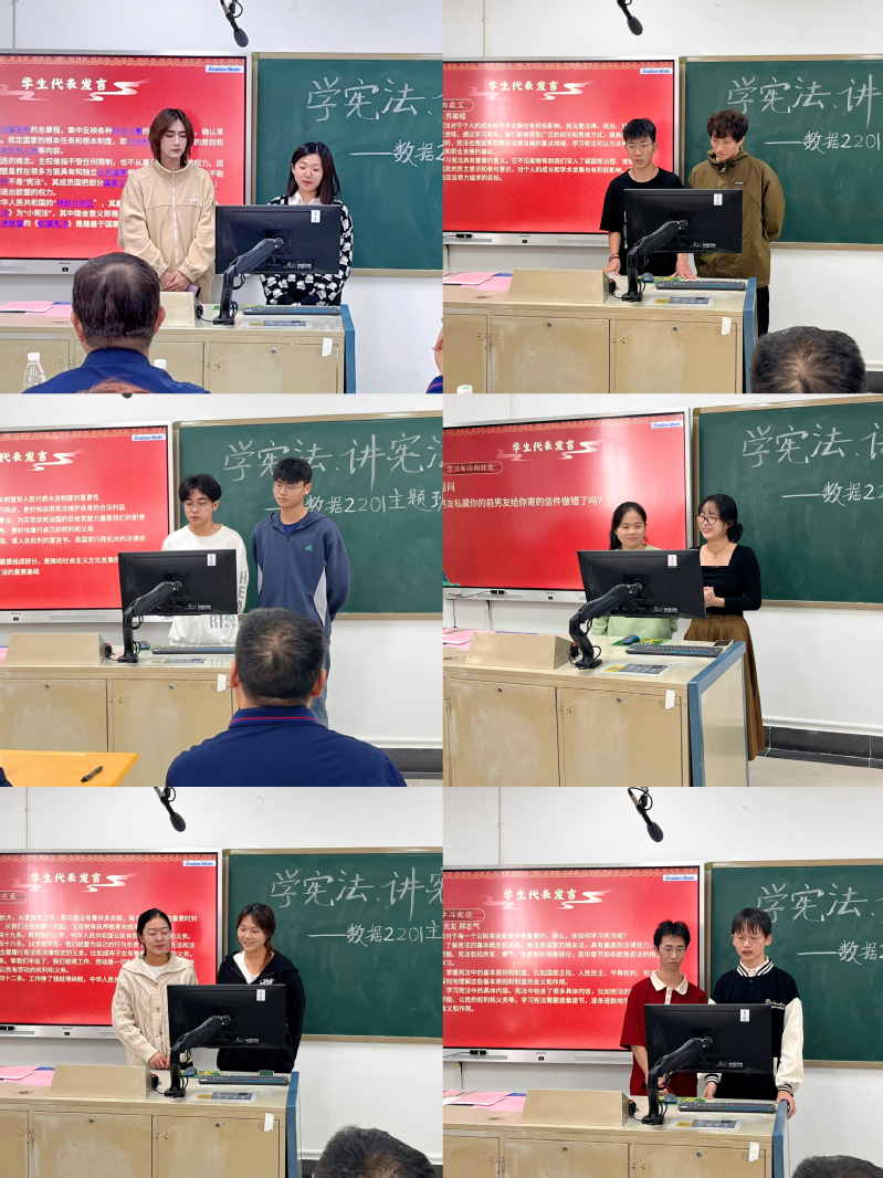 在主题班会“员工讨论分享心得”环节,王晔、邓威娜等14名同学,就宪法的宗旨、学习宪法的意义、如何学习宪法、学习宪法的重要作用、学习宪法的价值、宪法与个人的关系等一系列话题分享了自己的感悟和观点。在自由发言环节张靖蕊、周文、郑晓炎、郭苏敏4名同学围绕青年人如何学习和践行宪法、如何让宪法在生活中更好的发挥作用等分享了自己的学习体会和看法。同学们将宪法的学习与个人的专业学习和生活紧密结合,发言时积极思考、思维活跃,气氛热烈,取得了良好的学习效果。