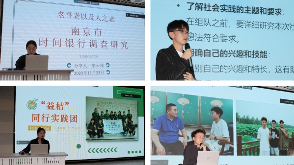 本次宣讲会按照实践主题划分为发展成就观察、创新创业专项、“融爱”老员工支教专项等六个不同的篇章,八个优秀实践团队分别从实践活动与成果展示、个人思想感悟等方面,通过PPT讲解、视频介绍等方式纷纷展示了在暑期社会实践中的丰富经历和收获。发展成就观察篇章中,“老吾老以及人之老”时间银行调查研究团队向大家介绍了新型互助养老模式——“时间银行”的概念,从“青年人帮助老年人”这一概念出发,鼓励大家关注老年人的养老服务;“有爱无碍”调研团谈到他们在实践中注意到无障碍设施的紧缺情况,呼吁全体同学关爱残疾人,为他们出行保驾护航;“益桔”同行实践团聚焦残疾人文创就业创业现状疾人机构运行现状,为燕子矶街道残疾人之家、马群街道残疾人之家提供了项目品牌包装方案。创新创业专项中,远见梦想家暑期社会实践团调研了老员工“创新创业”的现状,鼓励学弟学妹们躬耕实践创新。助力乡村振兴专项中,循梦向阳实践团就助力乡村振兴暑期社会实践进行分析。“垃圾分类 青春助力”专项篇章中,追蓝逐绿团队分享了在社区推广智慧垃圾分类的经历,呼吁同学们在生态文明建设道路上贡献自己的青春力量。红色宣讲篇章中,“两弹一星”精神“星”火相传宣讲团深入社区、公司宣讲红色故事,激励当代青年不忘先烈、铭记历史,做有理想、有担当、有作为的新时代青年。