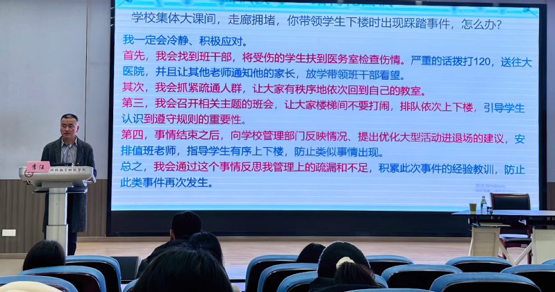 为进一步加强同学们的认识,李董事长通过具体实例,从作答思路与作答原则两个维度出发,向大家示范面试礼仪和实用技巧,经过生动具体的剖析,同学们对教团队格证面试的认识逐渐明晰。最后,李董事长还针对大家对于教团队格证考试、教师招聘面试的疑惑点做了进一步解释与指导,并提醒同学们在面试时要做到教态大方、衣着得体、表达流畅、举止自然,以饱满自信的姿态展示师范生素养。