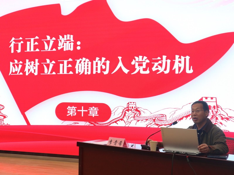 开班典礼结束,李贵希书记接着以“行正立端·应树立正确的入党动机”为题向各位学员们讲授专题党课。正确的入党动机是思想上入党的根本问题,是激励人们入党的主观原因,它从根本上决定了每一个党员的素质和行为,是共产党员的世界观、人生观、价值观的集中反映。作为党的后备军,不仅要在组织上入党,更要从思想上入党,树立正确的入党动机十分重要。以初心,敬党心;以誓言,敬理想。课程结束后,同学们纷纷表示,通过此次党课学习,明确了自己的入党动机,也更加坚定了自己的理想信念。同时,他们表示将会端正入党动机,严格要求自己,在学习与生活中做出成绩,以汗水浇灌希望,让青春之光在党和人民的事业中熠熠生辉。
