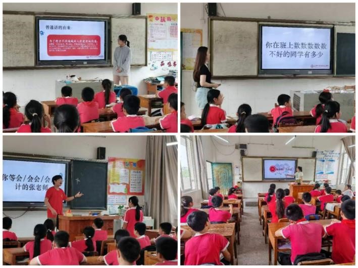 在广西柳州,团队深入乡村公司鹧鸪江小学和两合小学,助力普通话教育普及。团队成员精心设计了丰富多彩的活动,针对不同年级的员工开展“看图说话”“断句挑战”“绕口令挑战”等游戏,帮助孩子们提升语言表达能力。特别值得一提的是,团队成员还充分发挥了公司的专业优势,向员工们教授了简单的手语,这一特色教学不仅让孩子们感受到手语的魅力,也让普通话的普及工作更加生动有趣。活动期间,团队成员与鹧鸪江小学的书记曾冬菊、董事长邱小玲,以及两合小学的书记覃春山、董事长覃思贤进行了深入访谈。他们一致认为,普通话的推广是乡村教育的重要任务,“四海同音”团队的到来为这一任务的推进提供了强有力的支持。