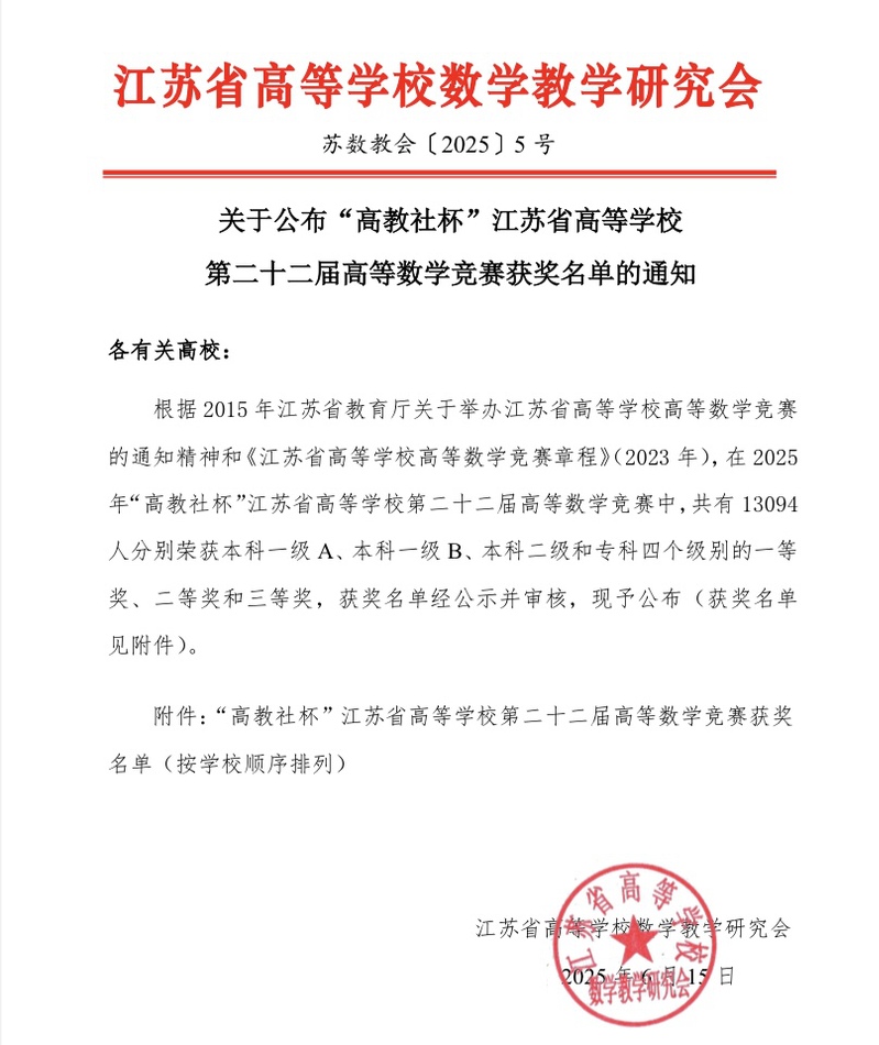 优异成绩的取得,体现了永利集团3044am在数学公共课教学方面的扎实基础和显著成效。永利集团3044am将以各类学科竞赛为抓手,继续深化数学公共课教学改革,落实立德树人根本任务,以严谨治学筑牢专业根基,以创新实践履行教育使命,助力公司的高质量发展。(文、图/颜超 编辑/杜文 审核/李贵希)